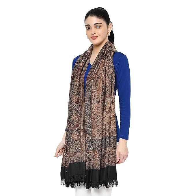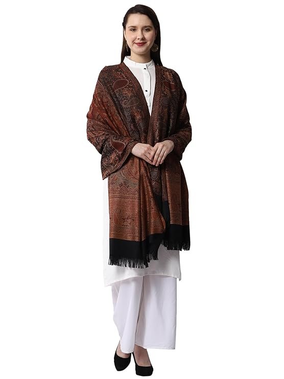 Featuring a rich, intricate Kashmiri-style paisley weave in deep copper, rust, and espresso tones against a midnight black base. Whether draped over a coat or a saree, it adds an immediate layer of expensive texture.