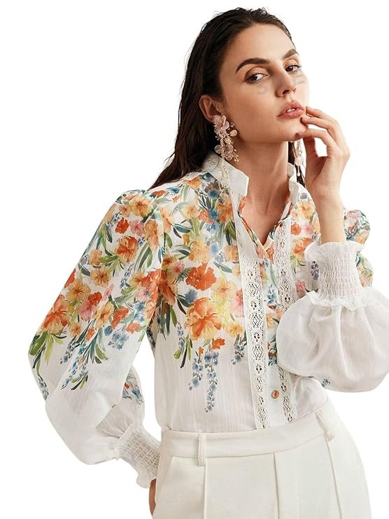 Elevate your everyday style with this stunning Vintage Garden Floral Blouse. Featuring a vibrant wildflower print in orange and blue on a soft white base, this shirt stands out with its delicate vertical lace detailing down the front.